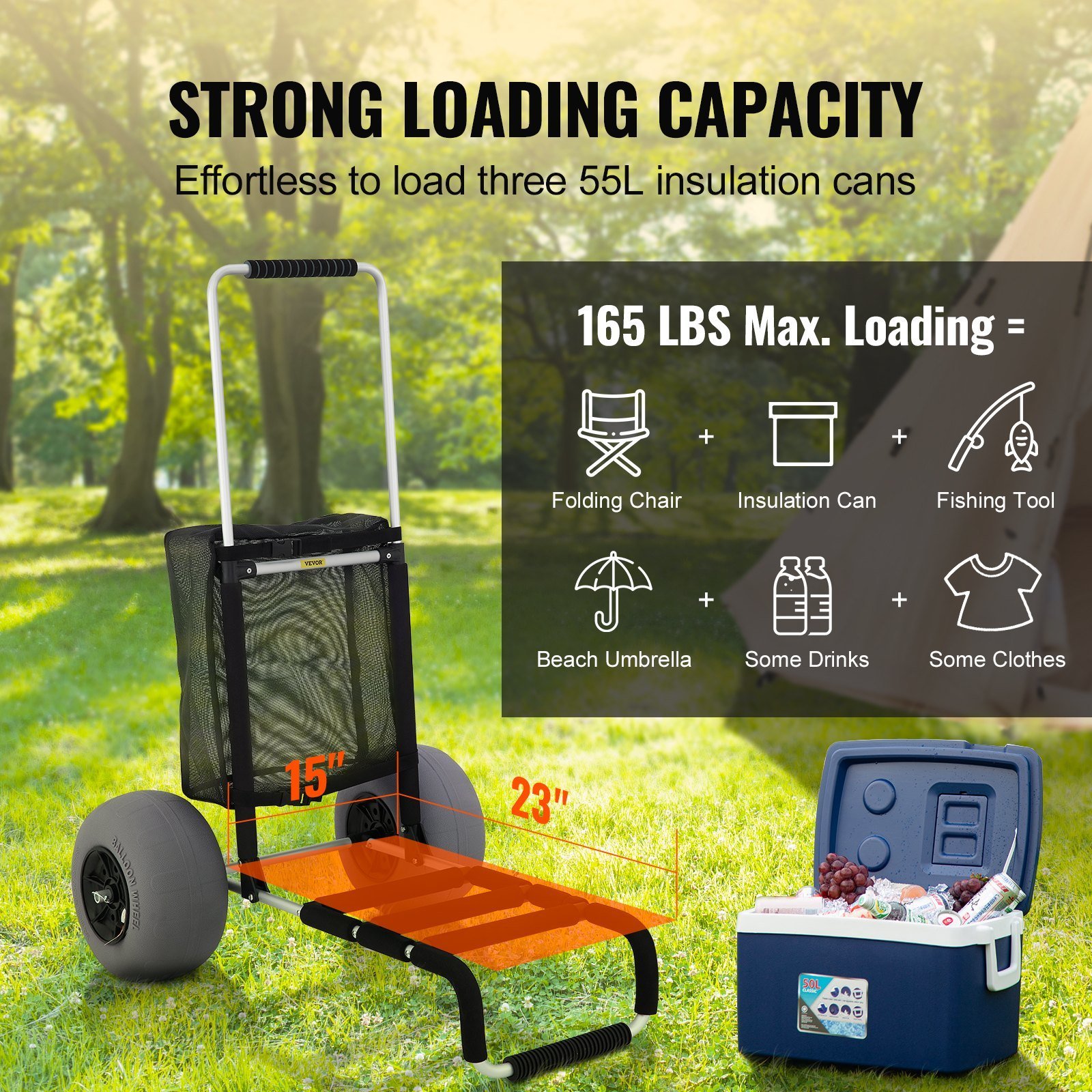 • Don't settle for anything less - choose our Folding Beach Cart for a more relaxing outdoor experience. VEVOR's beach cart is here for you to carry all of your gear. 2 PCS x 13 inches TPU beach tires are for effortless movement and transportation, and a larger 23" x 15" cargo deck can hold more gear. Wherever you go, the foldable sand cart will be right there to make sure you've got everything under control.